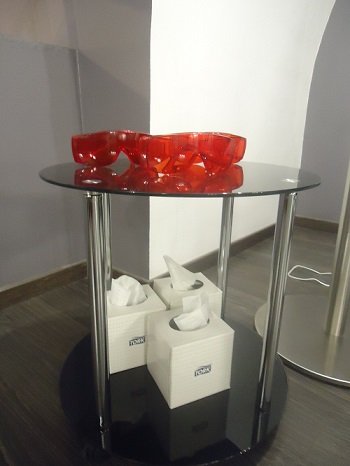 Bár a kezelés előtt nem kötelező a fogmosás, de az üzletben egyszer használatos fogkefével erre is van lehetőségünk. Miután beültem a székbe, kaptam egy trendi, piros szemüveget, egy doboz zsebkendőt és az ún. textilujjat, amit fel kell húzni az ujjunkra. Erre a kis anyagra az asszisztens egy aktiváló, tisztító spray-t fújt, mellyel megtisztítottam a fogakat kör-körös mozdulatokkal, pont mintha fogat mosnék.