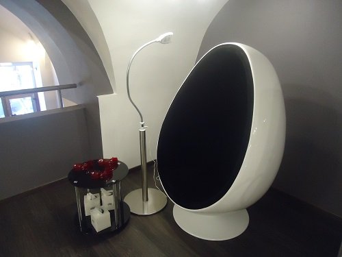 Én időközben helyet foglaltam a furcsa, tojás formájú fotelben, ami talán a Man in Black-ből lehet ismerős. Nagyon kényelmesen, könnyen el lehet benne helyezkedni, ami fontos, ha az ember lánya 3×15 percig kénytelen egy helyben ülni, és széles szájjal „vicsorítani”.