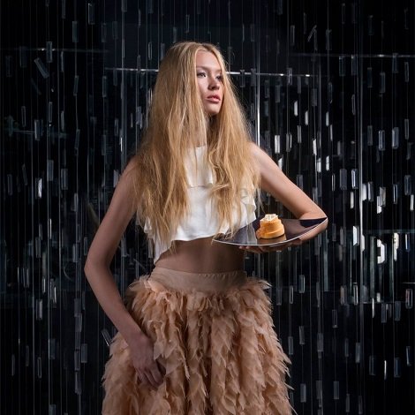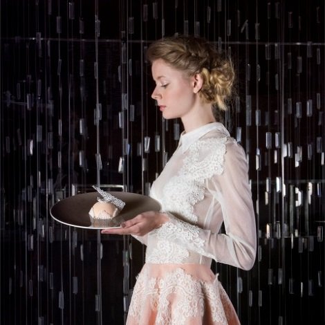 A tervezőasztal mögött megálmodott ruhák, már teljesen kész állapotban, gyönyörű modelleken vonultak fel előttünk, amelyekhez csatlakozott a Sofitel Budapest Chain Bridge Hotel egy-egy zseniális mestercukrásza is, hogy közösen mutassák be a közönség számára az újfajta süteményeket.